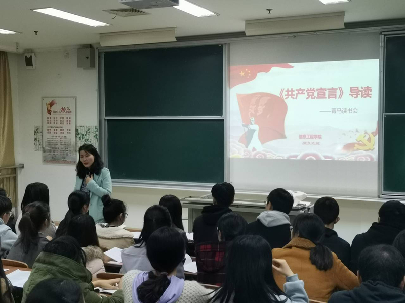 阅读经典,回归本分。为积极响应学校读书会活动,提高学生文化素养,丰富学生课余生活,我院青马读书会于11月20日晚于主楼B204开展《共产党宣言》导读活动。学生党支部书记季芳芳担任导读老师,17级党员发展对象,以及183、184、199、1910班同学参加活动。