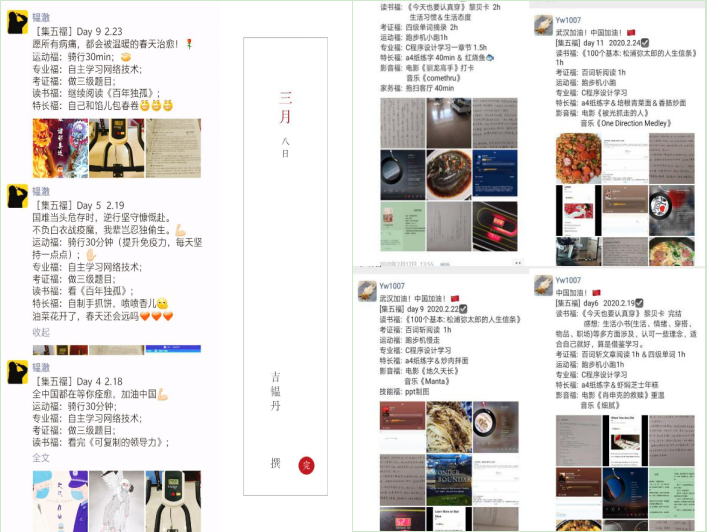 活动持续整一个月,内容丰富、形式多样,通过网络流行的“集五福”方式进行,帮助同学消除焦虑情绪、合理安排时间、充实业余生活,以自身行动支持疫情防控。“集五福”包括集“读书福”、“考证福”、“运动福”、“专业福”、“特长福”,通过每天线上打卡形式参与,通过集五福、勤学习、爱生活、共运动方式,在家提升自我,锻炼身体、陪伴父母。最终,集得“福”字最多的前三名同学可获“五福达人”荣誉称号。