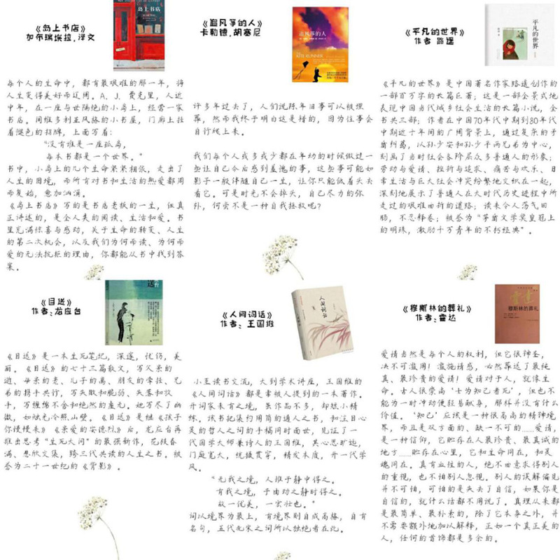 本次活动围绕“书香助力疫战,悦读通达未来”主题,举办了“悦读交流”“好书征集令”“全民晒书单”等系列活动,线上分享佳作、征集名言。受疫情影响,同学们全程线上互动,邮箱往来,人人参与,活动参与者通过积极向他人推荐优秀书籍、介绍读书格言、摘抄名篇名段、抒发读书感悟等方式,分享好书、快乐读书、习惯读书。最终,听雨轩将参与者用心推荐的书目制作成了漂亮的“悦”读手账,激起院内师生强烈的阅读共鸣。