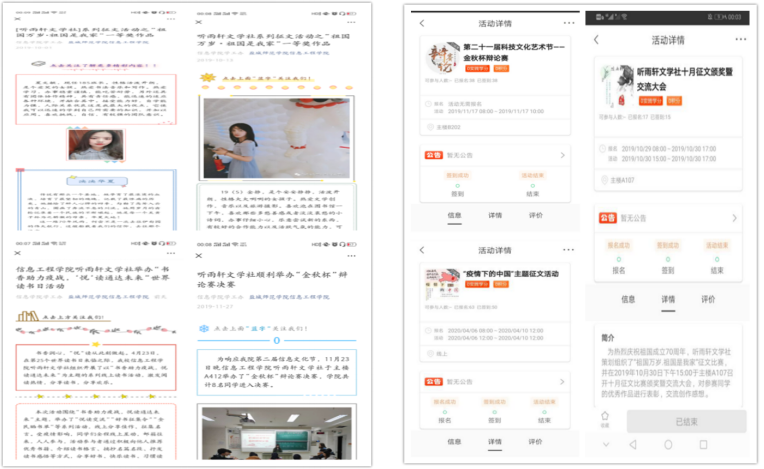 一路跋涉,一路执着,听雨轩文学社至今已成立19年。本着“文章合为时而著,歌诗合为事而作,以文养性,以久留香,广招贤士,共塑辉煌!”的宗旨,举办各类特色活动,展示学生风采。在过去一年中,听雨轩文学社先后开展了“飞花令动员交流会”“‘窃听风雨,细赏云烟’作品交流会”“‘祖国万岁·祖国是我家’征文活动”“金秋杯辩论赛”等活动共计14期。活动中,社团成员不断总结经验,提升个人文学素养,为自己大学生活添上浓墨重彩的一笔。