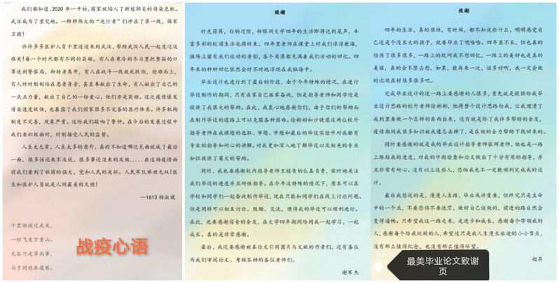 大学生活圆满落下帷幕,离不开老师与同学的帮助。疫情之下的毕业季注定与往年不同,让我们一起看看他们的致谢词,感受他们对于母校、对于老师的感激之情!
