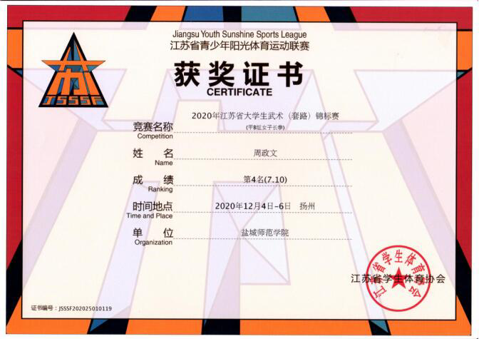 我院软件工程专业193班周政文同学在体育学院教练陈鹏老师的带领下,沉着应战,取得甲B组女子剑术第三名、长拳第四名的好成绩,并获得“优秀运动员”荣誉称号。